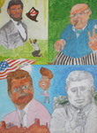 2014President Abr. Lincoln, tevens verbeeldend met toneelgordijn en slaaf. Engels premier Churchill en morsetekens. Pres. John F. Kennedy, ook andere Kennedy's in Kennedy-dynastie, wellicht in rotsen South-Dakota.