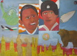2014Vrijheidsbeeld VS, Obama, met op achtergrond Amerikaanse vlag, New York maar bovendien de drone. Spoetnik, Russische raket, Poetin, Russische beer, Moskou en Peter de Grote.